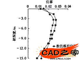 由圖5可以看出。由于軟土的流變特性,樁的最大位移并非發生在樁頂,而是發牛在距樁頂3 m以下部分。與實際情況相符。所以三維有限元模擬分析成果和基坑真實情況在整體上相吻合。