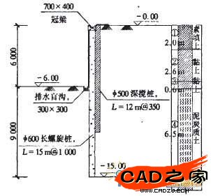 采用ANSYS有限元分析方法,針對某基坑剛性支護結構與相關巖土參數進行了支護結構穩定性及變形計算。模擬范圍和計算參數如下:基坑圍護采取鉆孔灌注樁支護結構(見圖1)。基坑開挖坑深6.00 m,基坑尺寸為40 m(短邊)×80 m(長邊),基坑圍護結構采用Ф6000@1 000鉆孔灌注樁,樁長為15.00 m,樁頂設置800 mm X 500 mm冠梁。混凝土強度等級為C30。計算時考慮施工超載15 kPa。