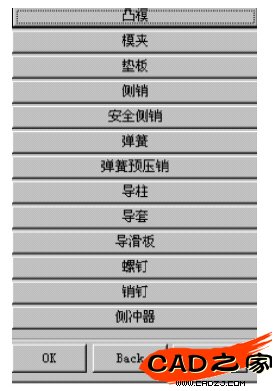 下模組件是由下模體和一些標(biāo)準(zhǔn)件組成。我們可以利用沖裁模CAD系統(tǒng)中的標(biāo)準(zhǔn)件庫(kù)直接生成實(shí)體模型,進(jìn)行裝配。如果要在導(dǎo)向位置上安裝導(dǎo)滑板,應(yīng)首先將當(dāng)前工作坐標(biāo)變換到安裝位置上,然后就可以在標(biāo)準(zhǔn)件庫(kù)中調(diào)用所需安裝的標(biāo)準(zhǔn)件了。
