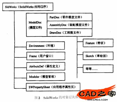 不管是用VC++ 、VB還是VBA對SolidWorks進行二次開發,都是通過調用SolidWorks的對象體系結構來進行的。基于OLE技術SolidWorks,API將SolidWorks, 的各種功能封裝在SolidWorks,對象之中供編程調用。作為一個對象,它包括以下幾個方面:(1)對象的類型;(2)對象的屬性;(3)對象的方法。開發者通過操縱對象的屬性和調用對象的方法建立自己的應用程序,實現二次開發。例如,建立一個長方體,可以訪問零件實體模型,則SolidWorks, 提供對象類型為PartDoc,它包含的屬性有MaterialldName、MaterialUserName、MaterialPorpertyValues, 它提供的方法有CreateNewBody(創建一個新實體)、EditRebuild(重新編輯實體)、FeatureByName(返回實體特征名)等。SolidWorks開發系統圖如圖1所示。