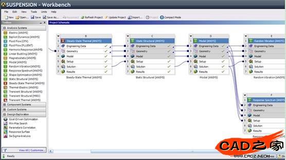 ANSYS Workbench作為一個框架,整合現有的應用,將仿真過程結合在一起,這一點在ANSYS Workbench2.0 沒有改變。但在工程頁引入了工程圖解的概念,見圖1。通過該項功能,一個復雜的包含多場分析的物理問題,通過系統間的連接實現相關性。圖表元素右邊的狀態符號顯示了該項設置是否需要更新、輸入等,方便用戶查看設置狀態。
