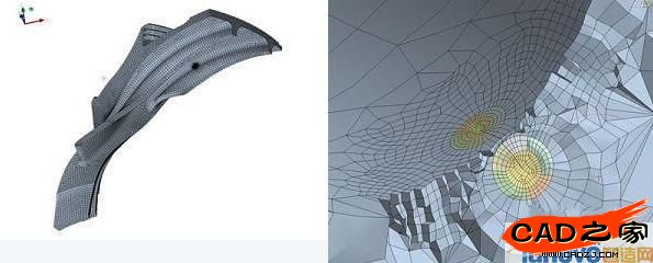 R12.0提供的自動網格劃分解決方案在流體動力學中取得了很好的結果。應用GAMBIT和TGrid的網格附加功能,R12.0可以在用戶最少的輸入下自動生成CFD合適的四面體網格。另外,它融合了高級尺寸函數(與GAMBIT相似)、棱柱及四面體網格(來自TGRID)及其他網格劃分技術,改進了網格平滑度、網格質量、劃分速度、曲率近似功能捕捉、邊界分層捕捉等功能。盡管許多功能是出于流體動力學的應用而改進的,但是它們仍然可以用于其他仿真分析應用。如結構分析的用戶可以應用這些功能,得到自動化和高質量的網格。新增多區域網格劃分方法使用戶在不進行幾何分割的情況下,可以對復雜的幾何模型劃分純六面體網格,圖4為對制動器轉子執行一次操作所得到的六面體網格。