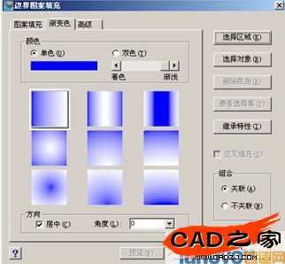 漸變填充區域的選取方式、與邊界的關聯屬性及孤島檢測等都和圖案填充相同。ICAD中雙擊一個漸變填充實體,就可以對其進行修改。