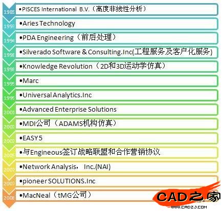 1982年MSC公司在美國紐約證券交易所(NYSE)上市。MSC.Software從1989年初開始積極而有計劃地采取一連串的并購行動。不斷的借助收購并購提升、完善自身的分析能力,并通過整合多種分析程序,推出了SimManager、SimXpert、SimDesigner與MD Nastran-Adams的多學科聯合解決方案。