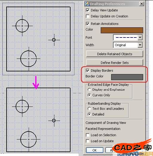 在NX2之前, 我們習慣了選擇“Preference& #1048774;Visualization& #1048774;Names/Borders”對話框里的“Show View Borders”選項來控制圖視圖邊框的顯示。但是在NX2里, 控制圖視圖的邊框顯示按鍵挪到“Preference& #1048774;Drafting”對話框中,見下圖