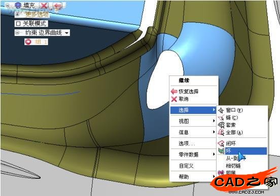 6、使用填充補(bǔ)此破面,如圖六所示。在ThinkDesign里給出了很多選擇邊線邊界的方法,用戶可以根據(jù)自己需要選擇不同的方式,以快速選中邊界,在此案例中用“環(huán)”來選擇需要填充的邊界。
