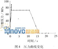 圖4示出進料口位置的壓力在注射、保壓、冷卻整個過程中的變化。從圖4可以看出,從剛開始注射一直到快充滿型腔時,注塑壓力直線上升,最大為90 MPa,隨后壓力迅速降低至約72 MPa,一直持續到11s,從11s以后壓力逐漸降低為0.整個周期約22s。