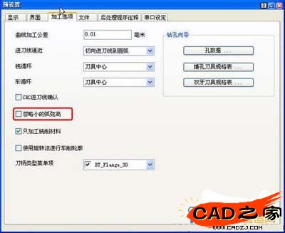 這樣就可以根據需要任意調整想要直線插補還是圓弧插補了。不過想要圓弧插補時還得注意GibbsCAM的一個設定。在菜:文件/預設值對話框的“加工選項”頁,確?!昂雎孕〉幕∠腋摺睆瓦x框不要選中,否則運算刀路時則會忽略很小段的圓弧特征。