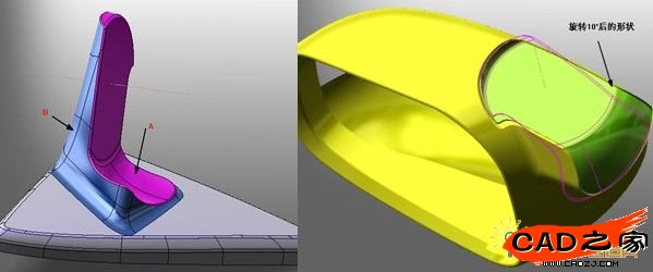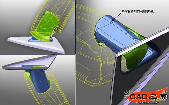 6. 將連接座與鏡體的配合部位分為A和B兩個部分,由于A與鏡體有配合要求,所以把A也繞旋轉軸線向車身后旋轉約10°,結果見圖5。在圖6中我們可以看到A旋轉后,B需要與之匹配,才能滿足配合部位的設計需求。