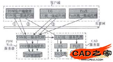 圖1中,①表示PDM客戶端軟件請求PDM服務的過程,②、③分別表示PDM向CAD、CAD向PDM集成的過程。