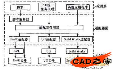 (2)適配器層。屏蔽不同CAD二次開發(fā)接口的差異性以及提供接口調用的腳本支持。由一個適配器管理器、若干個CAD適配器和腳本解釋器組成。適配器管理器根據(jù)必要的信息加載正確的CAD適配器,通過CAD適配器來完成實際的接口功能。CAD適配器對應每一種CAD,調用CAD提供的二次開發(fā)接口或直接讀取CAD文件來實現(xiàn)統(tǒng)一接口。