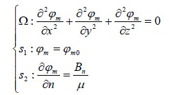 對(duì)于永磁電機(jī)的空載工況因求解區(qū)域不存在電流,依據(jù)恒定磁場(chǎng)下的麥克斯韋微分方程組,軸向磁場(chǎng)永磁發(fā)電機(jī)內(nèi)的電磁場(chǎng)可以按照恒定磁場(chǎng)處理,其磁場(chǎng)問題的數(shù)學(xué)形式可用如下的標(biāo)量磁位拉普拉斯方程來(lái)描述。