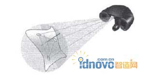 激光三角測距法是逆向工程中曲面數據采集運用最廣泛的方法,它具有數據采集速度快、能對松軟材料的表面進行數據采集、能很好測量復雜輪廓等特點。手持式激光掃描系統是對傳統的激光掃描儀的一個重大突破,掃描儀和掃描物體的相對位置都可以變換,這樣大大提高了掃描范圍和不同場合的掃描可行性。作者采用的Creaform公司的手持式激光系統REVscan由硬件和軟件兩部分組成:手持式REVscan激光掃描儀和VXscan數據處理軟件。如圖1所示為激光掃描儀工作示意圖。