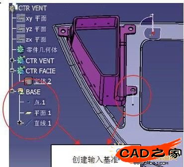 在調(diào)用螺釘柱的CATALOG文件之前,首先要定義基準(zhǔn)參數(shù)。以中央出風(fēng)口與螺釘柱配合的面為基準(zhǔn)面,以安裝孔的中心為基準(zhǔn)點(diǎn),作一條過基準(zhǔn)點(diǎn)的直線作為基準(zhǔn)線,如圖所示。