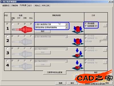 5X航空銑控制面板“干涉檢查”頁(yè)面設(shè)置以“最大角度傾斜刀具”,“使用前后傾角和側(cè)傾角”。