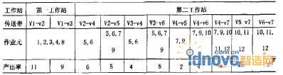 各作業(yè)元按順序和優(yōu)度值,向各工作站分配,并與節(jié)拍時(shí)間進(jìn)行比較,計(jì)算剩余時(shí)間。若剩余時(shí)間足夠安排下一作業(yè)元時(shí),就再找尚未分配的、優(yōu)度值較高的作業(yè)元,把它分配到工作站中;若剩余時(shí)間不夠再安排其它作業(yè)元時(shí),就向下一個(gè)工作站分配,依此類(lèi)推,直到將全部作業(yè)分配完為止。各作業(yè)元分配到工作站后,將工作站序號(hào)存于N矩陣