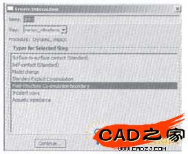 (3)耦合2個模型.具體操作為,激活其中1個模型,雙擊模型樹中的Interaction,進入Create Interaction對話框(見圖5),選擇Step以及Fluid—Structure Co—simulation Boundary,點擊Continue并選擇耦合面后,進入Edit Interaction對話框,點擊OK完成定義.另一個模型亦按照上述方法定義.