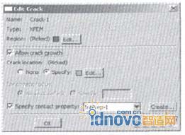 (1)切換到Interaction模塊,在主菜單欄中選擇Special→Crack→Create,彈出Create Crack對話框(見圖1),選擇XFEM,單擊Continue后選擇裂紋區(qū)域,確定后進入Edit Crack 對話框(見圖2),用戶可設置允許裂紋擴展、裂紋位置和contact property等參數(shù).