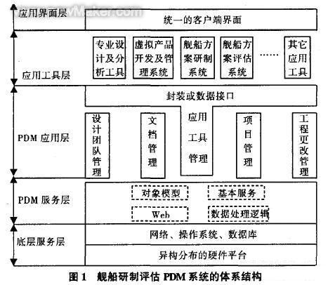 整體體系結構分五層,最下一層是硬件環境、網絡、操作系統、數據庫,這些都取決于具體PDM軟件對其的支持,例如:選用Windchil,只能選用Windows平臺和Oracle數據庫等。然后是PDM的服務層,現在較為通用的大型PDM軟件均采用面向對象結構,向下通過自己的數據處理邏輯直接與數據庫交互,向上提供基本服務供應用組件使用。PDM應用層主要是各種功能相對集中的應用模塊,其實各模塊之間有著密切的聯系,只是根據其功能把它們劃分開,根據針對艦船研制評估的分析,確定采用設計團隊管理、文檔管理、項目管理、變更管理四項主要功能,作為集成框架,還需要封裝各應用工具,并和特定的工具實現數據接口。最上層是對使用者和管理者一致的PDM客戶端界面。