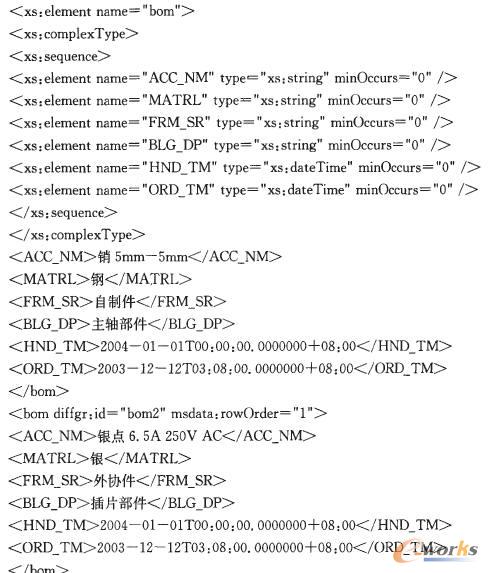 f)數據層:存儲BOM信息系統中的BOM信息表結構、SPROC與具體數據。所構建的基于Web Services的BOM信息管理系統基于上述的BOM架構與數據集成方案,更好地滿足了企業BOM的SSPD管理及相應應用需求,具有程序編寫代碼量小,良好的信息交換及容易擴展和部署等優點,并且可以跨平臺、跨防火墻調用和訪問相應方法。在基于XMI。和SOAP數據傳輸標準的BOM信息管理系統中,BOM信息核心數據交互樣例如下: