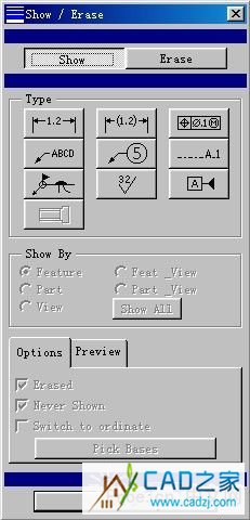 在DRAWING#p#分頁標題#e#模式下,選擇detail>show/erase,出現Show/Erase 對話框, Show/Erase對話框如右圖 。