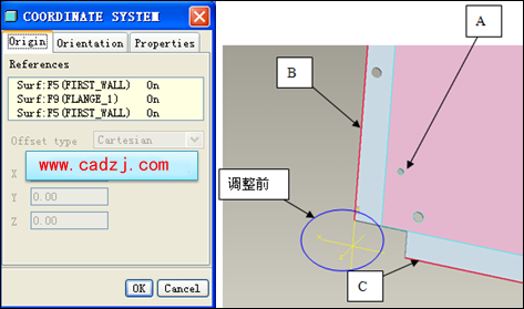 調(diào)整坐標(biāo)系的X、Y、Z軸方向,選擇Orientation后,在彈出對話框中進(jìn)行調(diào)整。調(diào)整Z軸方向垂直于平面A,X軸為橫坐標(biāo)沿C方向,Y軸為縱坐標(biāo)沿B方向。