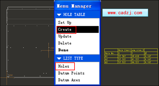 3)設(shè)置完表格的格式后,單擊創(chuàng)建…>孔…>選擇基礎(chǔ)坐標(biāo)系…>在圖紙上單擊一點(diǎn)用來放置孔表。如圖3。孔坐標(biāo)和孔徑便自動(dòng)顯示在表中。