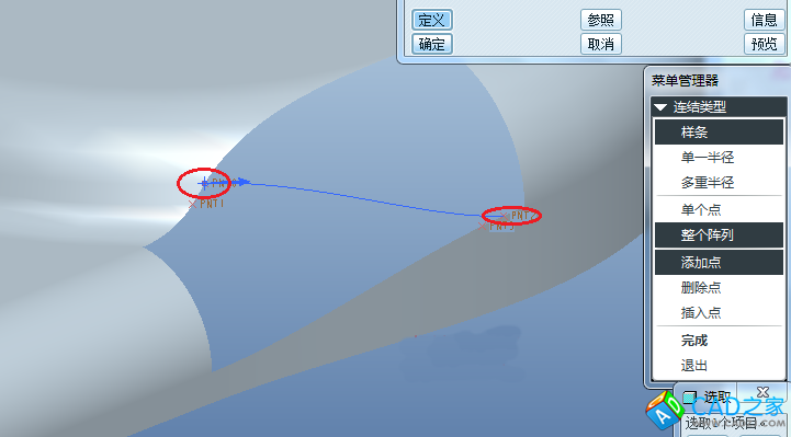 2.點擊【曲線】-【通過點】-【完成】,依次點擊下圖所示的兩個點并確定。