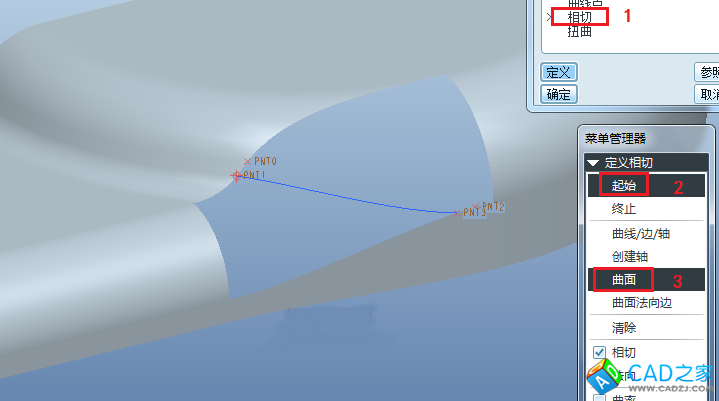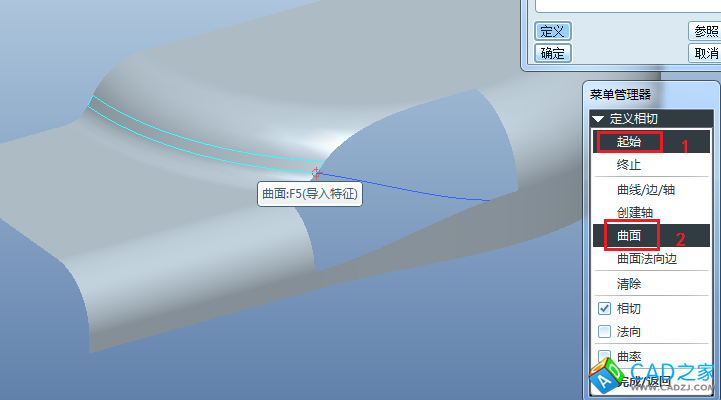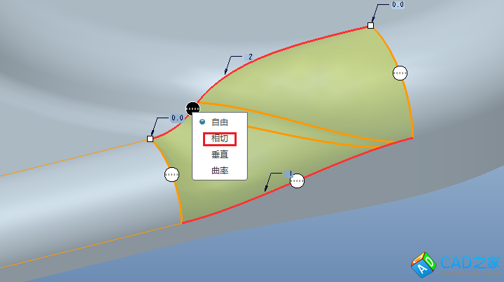 雙擊【相切】,分別設置曲線的起始和終止處與曲面相切,如下圖。