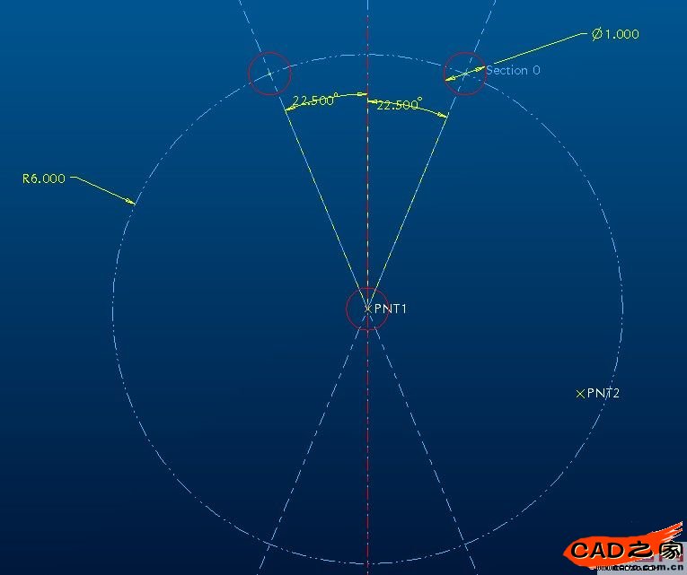 草繪一個圓,圓心在 PNT1,半徑值為 6”;
