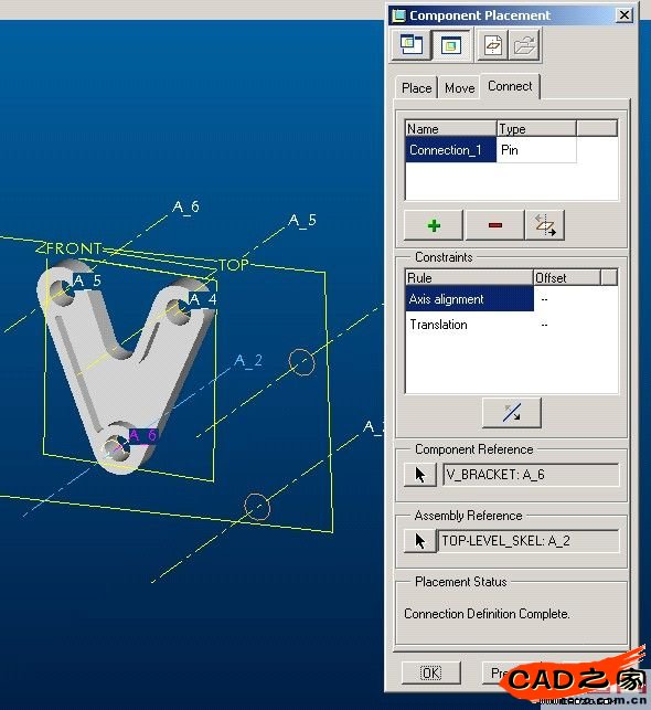 現在,編輯 v_bracket 零件的定義,并從軸 A_6 和 top-level_skel 零件上的對應軸創建銷釘接頭,然后為每個軸選擇“前”平面(如果它是垂直于銷釘的軸的平面)。(圖 6)