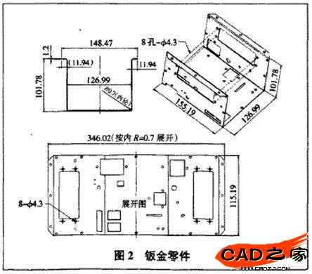 圖2所示的鈑金件,每個壁上都布有大小不等的方孔、圓孔,這些孔都有相應的裝配要求,是個典型的較高精度的鈑金零件。其中8個小4.3孔.同軸度要求在Φ0.1以內。零件材料Q235冷板,1.2mm厚,所有孔都在數控沖床下料時一并作出。對于這種高精度的鈑金件,如果展開的理論尺寸已經含有誤差,加工后的精度就無法保證。現以圖2零件為例,說明Pro/E鈑金設計時,如何確定折彎半徑。
