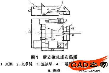 掘進(jìn)機(jī)屬長(zhǎng)臂類的機(jī)器,較長(zhǎng)的截割臂在截割作業(yè)時(shí),產(chǎn)生很大的截割力,此時(shí)行走履帶所受的外力比正常行走時(shí)將顯著增加,改變了正常行走時(shí)履帶與地面合理接地比壓的分布狀態(tài),形成整機(jī)的不穩(wěn)定,甚至產(chǎn)生劇烈振動(dòng)和傾翻。而后支撐的后部撐壓在地面上,可以增加機(jī)器的接地長(zhǎng)度,以防止和緩解履帶的接地比壓偏移,進(jìn)而增加整機(jī)的穩(wěn)定性。主要由支架、支撐腿、支架與二運(yùn)部連接架、二運(yùn)部回轉(zhuǎn)臺(tái)、銷軸和襯套等組成。
