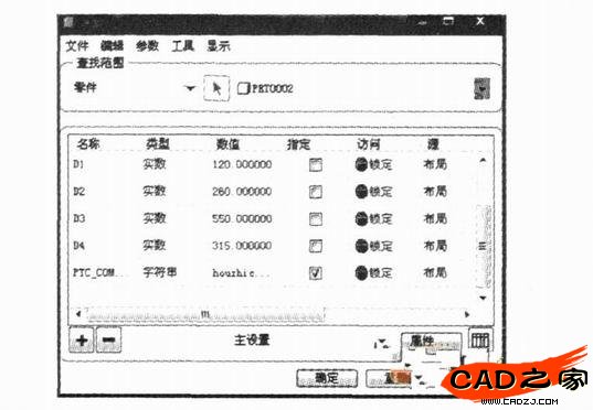通過布局向零部件中分配信息,需要在零部件中聲明,把零部件的各種信息聲明到布局中去,所聲明的參數(shù)必須與布局中的參數(shù)一致。當(dāng)作完聲明之后,在打開零部件的參數(shù)窗口中,就會(huì)發(fā)現(xiàn)參數(shù)窗口中多了布局中的參數(shù)值。以支撐腿零件為例,圖3為支撐腿零件的參數(shù)表,其上半部分是原零件的參數(shù),下半部分是布局的參數(shù)。