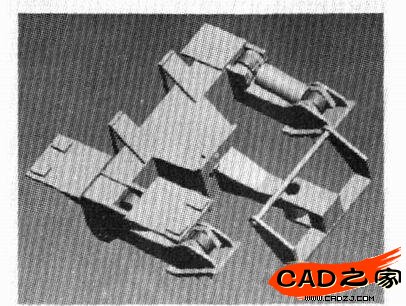 骨架的信息傳遞就是映射幾何特征,即(Geometry的傳遞,它是通過Publish Geometry和Copy GeometrY實(shí)現(xiàn)的。通過復(fù)制點(diǎn)、曲面和表面幾何和特征作為參考基準(zhǔn),再建立新的幾何特征。通過復(fù)制過來(lái)的這些點(diǎn)、曲面和表面作為參照,從而保證建立的零件具有復(fù)制元件的幾何特征。Geometry傳遞的是比較具體的形狀和數(shù)據(jù),如點(diǎn)的位置、曲線和曲面的形狀等,這些形狀和數(shù)據(jù)主要用于零件特征的建立。圖4為后支撐的總成模型。