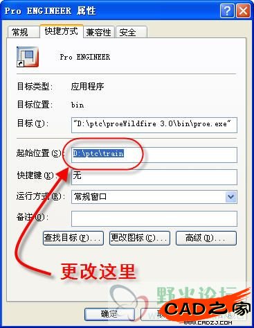 1、最簡單的是更改啟動文件夾,方法如下:右擊你的 proe 啟動快截方式,點“屬性”更改下圖中的“起始位置”,比如在 D 盤創建一個目錄 work ,然后更改為 d:work ,并確保在更改后的文件夾中可以創建文件夾或目錄,更改前可以測試一下。