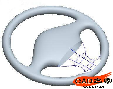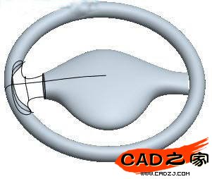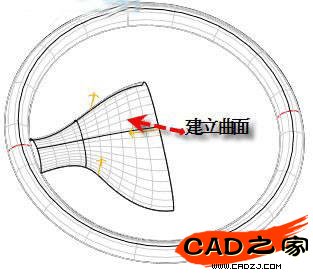 10、接著我們就要建立融合部分的曲面了。其實大家都知道這里應該切除扶手面。但在哪里切,卻不是很明了。當然切不是盲目的,要有目的地切。為了保持融合曲面與扶手曲面之間痕跡不明顯(其實痕跡明不明顯,主要是視覺的效果,如果我們把切的地方放在高光部分,那肯定會好些。),我們在扶手曲面的中間部分開始切,而且為了保持被切后邊的整體性,我們用的曲線應是一整條,這個操作步驟請參照PART文件。