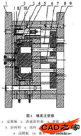 開模時(shí)在彈簧3的作用下,首先從分型面Ⅰ開模,在澆道拉料桿5的作用下分流道及澆口留在澆道卸件板2上,定模板1繼續(xù)滑動(dòng)。當(dāng)接觸到止動(dòng)螺釘7后停止運(yùn)動(dòng),這時(shí)分型面Ⅱ開模,在澆道卸件板2的作用下,澆道從澆口套4內(nèi)脫出,靠自重落下,在定距螺釘碰到定模板1后澆道卸件板2停止運(yùn)動(dòng)。這時(shí)分型面Ⅲ開模,當(dāng)動(dòng)模板9運(yùn)動(dòng)到指定位置,這時(shí)機(jī)床的頂出器推動(dòng)推板8,在推板的帶動(dòng)下,由頂桿6推動(dòng)的卸件板及頂桿聯(lián)合將零件頂出。