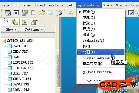 好了,開始吧,先打開裝配文件(switch.asm.neu.1),可把文件拖到proe,用asm方式打開,注意得重新用連接的方法裝配,然后切換到動畫