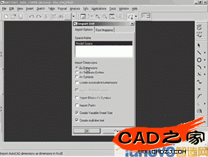“2D 輸入向導”允許用戶通過一系列單選按鈕和復選框只選取那些互相兼容的選項。例如,用戶可以選擇如何通過DXF輸入尺寸,或者是否讓這些尺寸彼此關聯。決定將AutoCAD塊作為符號輸入,還是創建一個大小可變的頁面。用戶還可以選擇將輸入文件中的字體映射為可用字體的一種,以供在Pro/ENGINEER繪圖中使用。