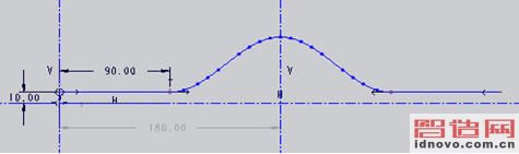 選擇菜單“插入/模型基準(zhǔn)/圖形”選項(xiàng),根據(jù)系統(tǒng)提示在消息輸入圖形名稱cuve2,確定后進(jìn)入草繪模式。在草繪模式中,在繪圖區(qū)繪制一個坐標(biāo)系,同時繪制兩條通過此坐標(biāo)系的中心線。選擇菜單“草繪/數(shù)據(jù)來自文件”選項(xiàng),選擇剛才輸出的“cuve1.igs”文件,打開后,在“縮放旋轉(zhuǎn)”對話框輸入比例和角度,拖動曲線至適當(dāng)位置,單擊確定按鈕推出。在草繪模式中對曲線進(jìn)行編輯增加,最終結(jié)果如圖10中所示。