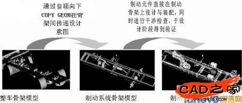 傳統的設計過程中,原有的幾何模型是設計者用固定的尺寸值得到的,零件的結構形狀不能靈活地改變,一旦零件尺寸發生改變必須重新繪制相應的幾何模型。所謂參數化設計即以一定量的參數控制零件的幾何模型,通過修改參數而改變幾何模型,從而改變零件的結構尺寸。利用參數化技術進行設計時,圖形的修改非常容易,用戶構造幾何模型時可以集中于概念和整體設計,因此可以充分發揮創造性,提高設計效率。我們知道卡車產品一經定型,在其眾多系列變型產品中,一些零部件的結構基本不變,通常都是個別的地方有所改動或改變總成的位置更換總成,如切換、變動軸距等.在原車基礎上進行變型車設計能充分體現出參數化的優勢。卡車底盤總布置設計首要任務是確定底盤各總成的基本結構型式和空間大致位置,在只考慮零部件主要尺寸的前提下進行總成及零部件的空間位置及基本結構參數的動態修改。為此,首先必須抽取各零部件的總體參數,即與總布置有關的基本結構參數,如表征零部件外形輪廓的長、寬、高等的尺寸,零部件的定位基準等,通過這些總體參數控制零部件的簡化模型,進行變量化、參數化設計。在底盤裝配時,通過修改相應參數就可以實現汽車零部件的快速布置和基本結構尺寸的動態修改,這個用Layout來進行總布置的方法是卡車參數化總布置所要達到的一個目標。