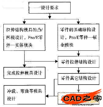 機械零件中鈑金零件有著很大的數量,而高效、準確地對其及其模具進行設計,在現代制造的要求下,變得越來越重要。目前常用的一些CAD/CAM軟件也為鈑金零件及其沖壓模具的設計提了高效便捷、準確快速的手段。本文以Pro/ENGINEER為例,論述了沖壓成型的鈑金零件及其模具進行設計的過程與方法。圖1為設計流程圖,圖2為一個設計實例的鈑金零件圖。