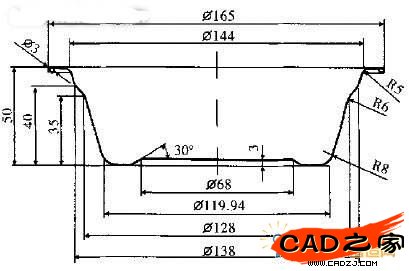 一般情況下,在拉伸成型后,工件口部或凸沿周邊不整齊,需要進行修邊,以達到零件的設計要求。因此,在計算零件毛坯的尺寸時,必須加上修邊余量Δh,如圖2所示碗形零件的中性層表面面積A=36538.3mm2,得出成型部分毛壞直徑215.69,根據零件的形狀和尺寸確定修邊余量為2mm,那么最終毛坯直徑: