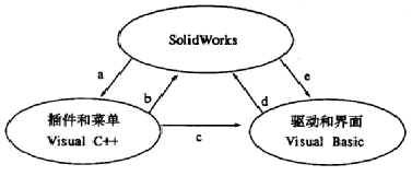 SolidWorks提供了多種二次開發方法,每種方法都各有所長,如果能將他們的優點集中起來,必將達到良好的效果.故考慮用VisualC++開發SolidWorks插件和菜單,用VisualBasic開發建模、裝配等驅動程序和人機交互界面,之間的邏輯關系如圖1所示.
