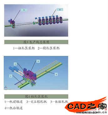 從圖2中可以看出,本生產(chǎn)線(如圖3)分為粗軋區(qū)裝配(如圖4)和精軋區(qū)裝配(如圖5)。其中,粗軋區(qū)裝配又由E立輥軋機(jī)、R粗軋機(jī)以及機(jī)前/后輥道組成。精軋區(qū)裝配由飛剪機(jī)、除鱗機(jī)、精軋機(jī)組以及輸出輥道組成。