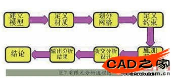 COSMOSWorks分析流程如圖7所示。首先建立模型并定義材料性能,劃分網(wǎng)格,然后定義空間幾何約束、施加力、壓強(qiáng)等載荷就可以進(jìn)行分析。輸出分析結(jié)果后,對(duì)缺陷處進(jìn)行改進(jìn)優(yōu)化后重新進(jìn)行分析,直到符合要求。