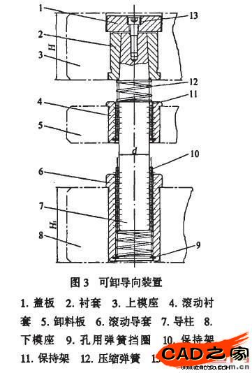 應用SolidWorks的配置功能既可進行零件建庫,也可進行組件建庫。在完成各組成零件配置之后,在裝配體環境下可進行組件的建庫設計。圖3所示級進模的導向裝置根據上、下模座厚度不同,選取不同直徑的導柱,導柱與相關的導套、襯套、蓋板、壓縮彈簧、保持架、彈性擋圈、螺釘構成組件,如表1所示。這種組件的建庫利用配置功能實現。利用組件建庫方法: