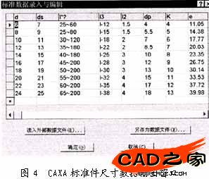 (5)系列零件設計表文件主要存儲標準件的各種參數,這些參數可以通過將CAXA標準件庫數據輸出而獲得,包含了標準件所具備的幾何數據,并將這些特性通過參數文件的形式傳遞給三維標準件模型。當改變系列零件設計表文件中有關尺寸變量的取值時,即改變尺寸配置,通過尺寸驅動處理即可生成一系列大小符合實際尺寸的標準件。也就是說每一類標準件只需建模一次就可以得到完整的標準件系列。