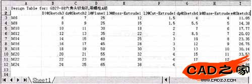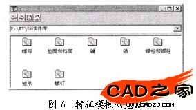 打開 Microsoft Excel 并生成一個工作表。在工作表的第一列(行標題單元格 A3、A4等)中,輸入您想要生成的配置名稱。本例以螺栓的公稱直徑為配置名,保留單元格A2為空白。在工作表的第一行(列標題單元格B2、C2等)中,輸入我們要控制的螺栓各基本尺寸變量名,再將圖4中輸出的尺寸數據通過Excel的數據導入功能輸入到該工作表,以上過程參見圖4及圖5,將該工作表(即系列零件設計表)保存后插入到已建模完畢的螺栓模型文件中,即可得到從M6-M24的一系列螺栓3維零件模型。運用以上方法分別建立各類標準件模型文件后按目錄分類儲存在硬盤上,即可得到標準件庫。在裝配模型中通過Solidworks中的特征模板瀏覽器(如圖6)即可查詢、調用各種標準件,而更改同一類零件的不同配置就可以生成具有不同尺寸的符合國標的三維參數化標準件實體模型。